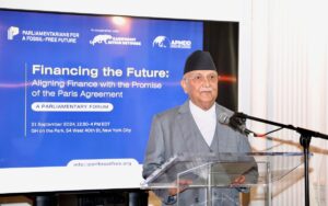 नेपाली प्रतिनिधिमण्डलको नेतृत्व गर्दै संयुक्त राष्ट्रसङ्घको ७९औँ महासभामा भाग लिने क्रममा संयुक्त राज्य अमेरिकाको न्युयोर्क पुगेका प्रधानमन्त्री ओलीले स्थानीय समयअनुसार शनिबार दिउँसो आयोजित जीवाष्म इन्धनमुक्त संसदीय सञ्जाल (पार्लियामेन्टेरियन्स फर फोसिल फ्युल फ्रि) को कार्यक्रममा मुख्य वक्ताका रूपमा सम्बोधन गर्दै क्षतिपूर्ति दिनुपर्ने विषय उठाएका हुन्।